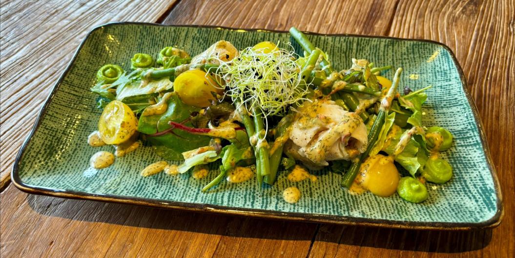 haricot verts • doperwten crème • cherry tomaat • licht pittige dressing